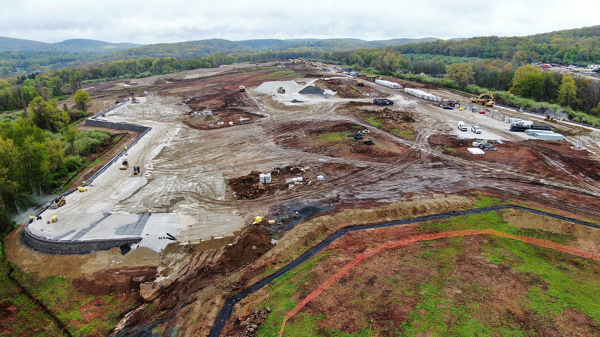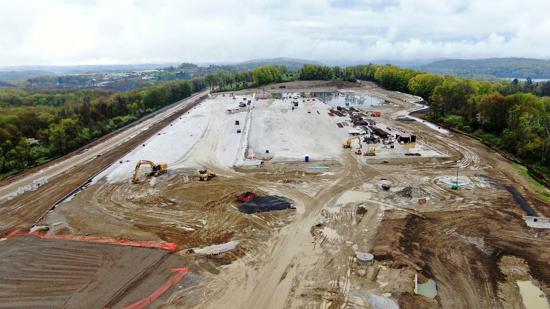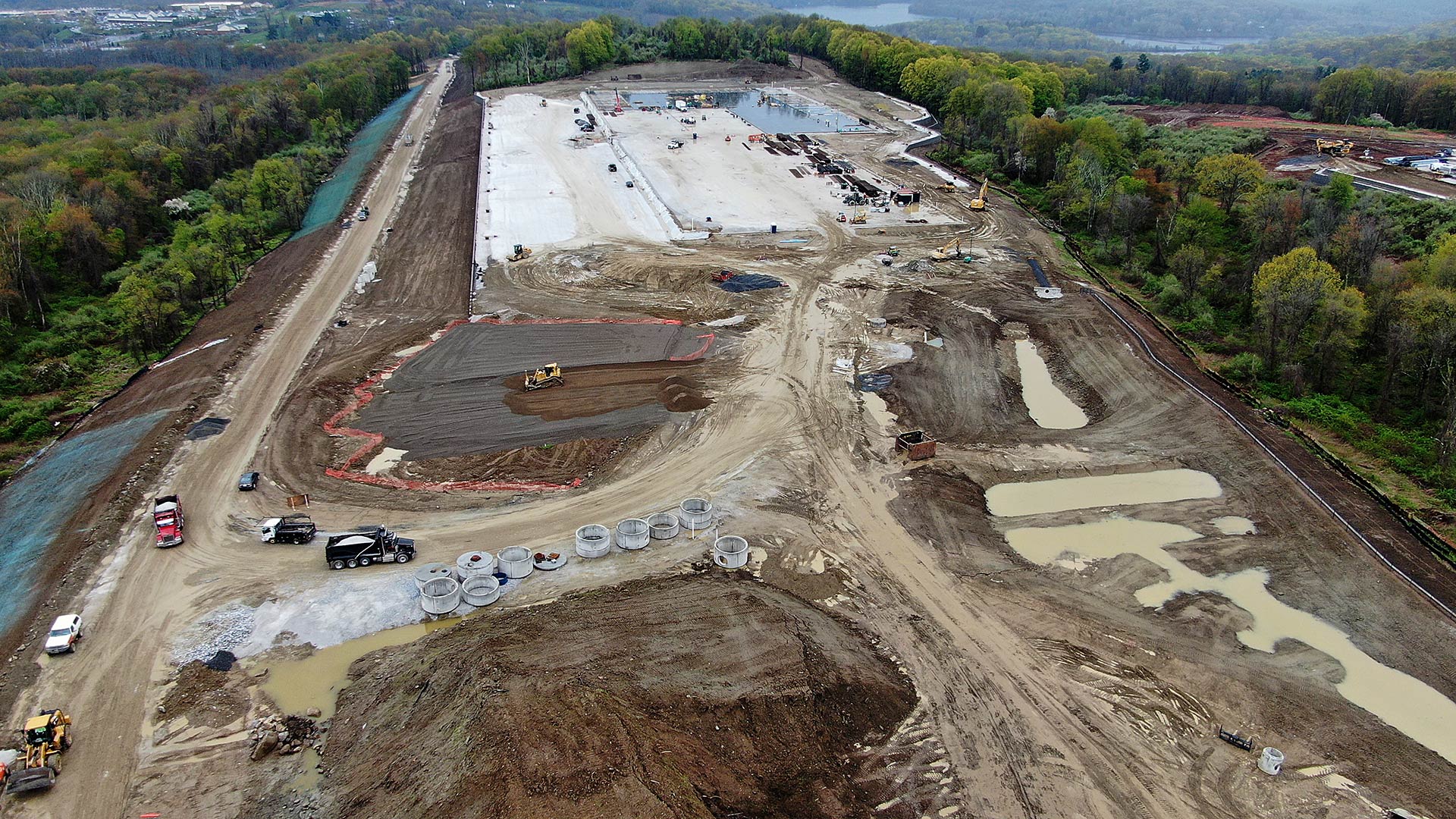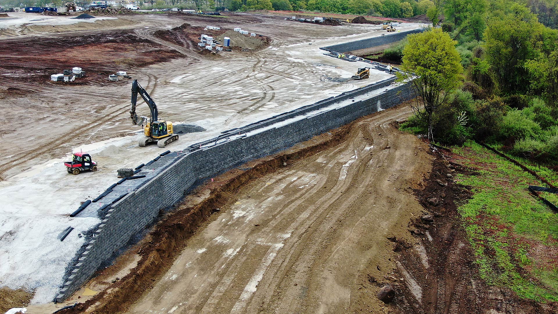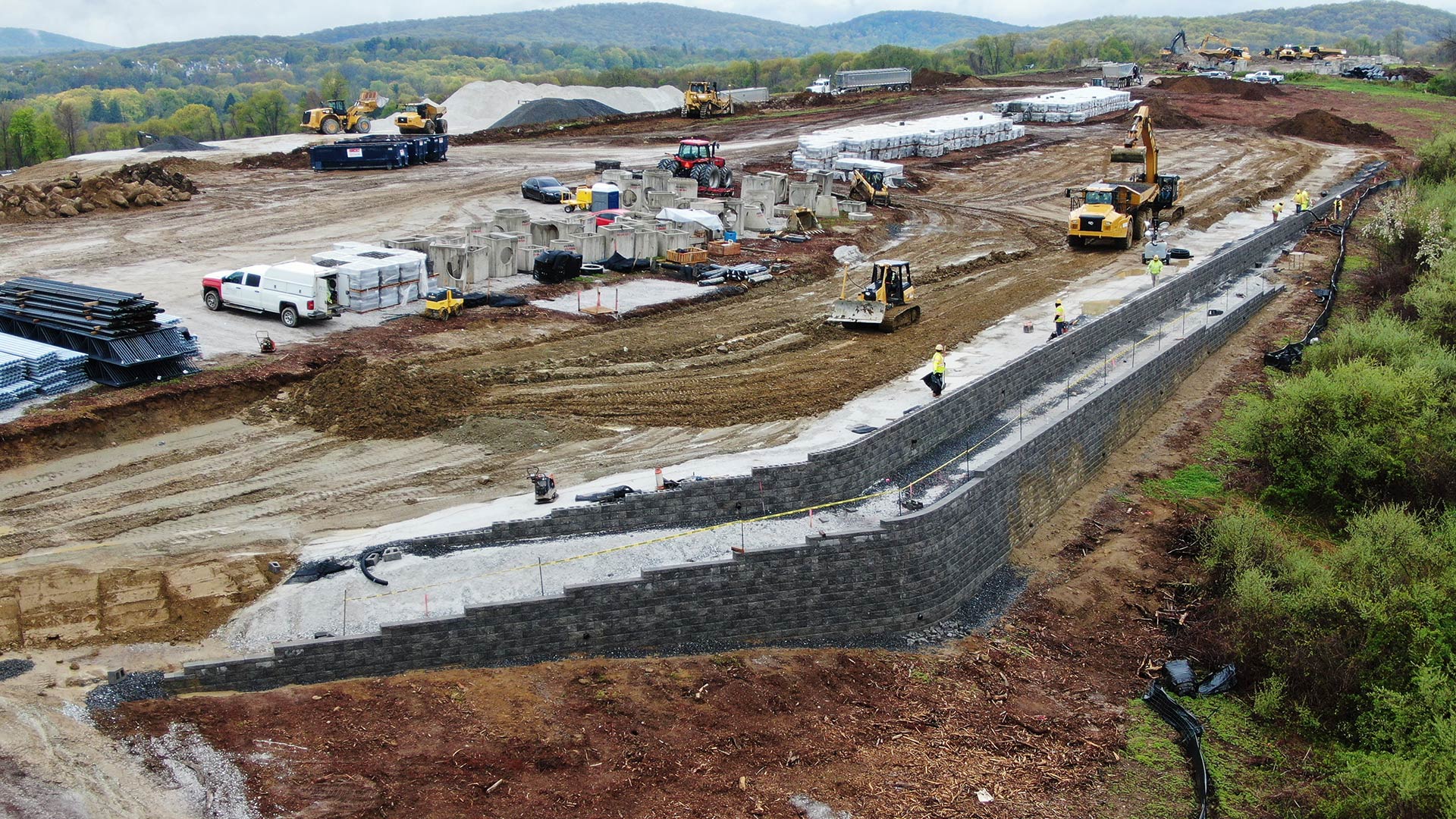 The Commercial Campus at Fields Corner is well underway with the planned development of two logistics warehouses totalling 933,100 square feet. The two buildings measure 303,100 SF and 630,000 SF, respectively. Petillo’s crew is preparing the site and sculpting the land to accommodate the stormwater management, distribution systems, and warehouse foundations. The retaining walls around the area are being constructed and backfilled with aggregate. The next phase includes warehouse construction and developing the surrounding shipping, delivery, and parking areas.