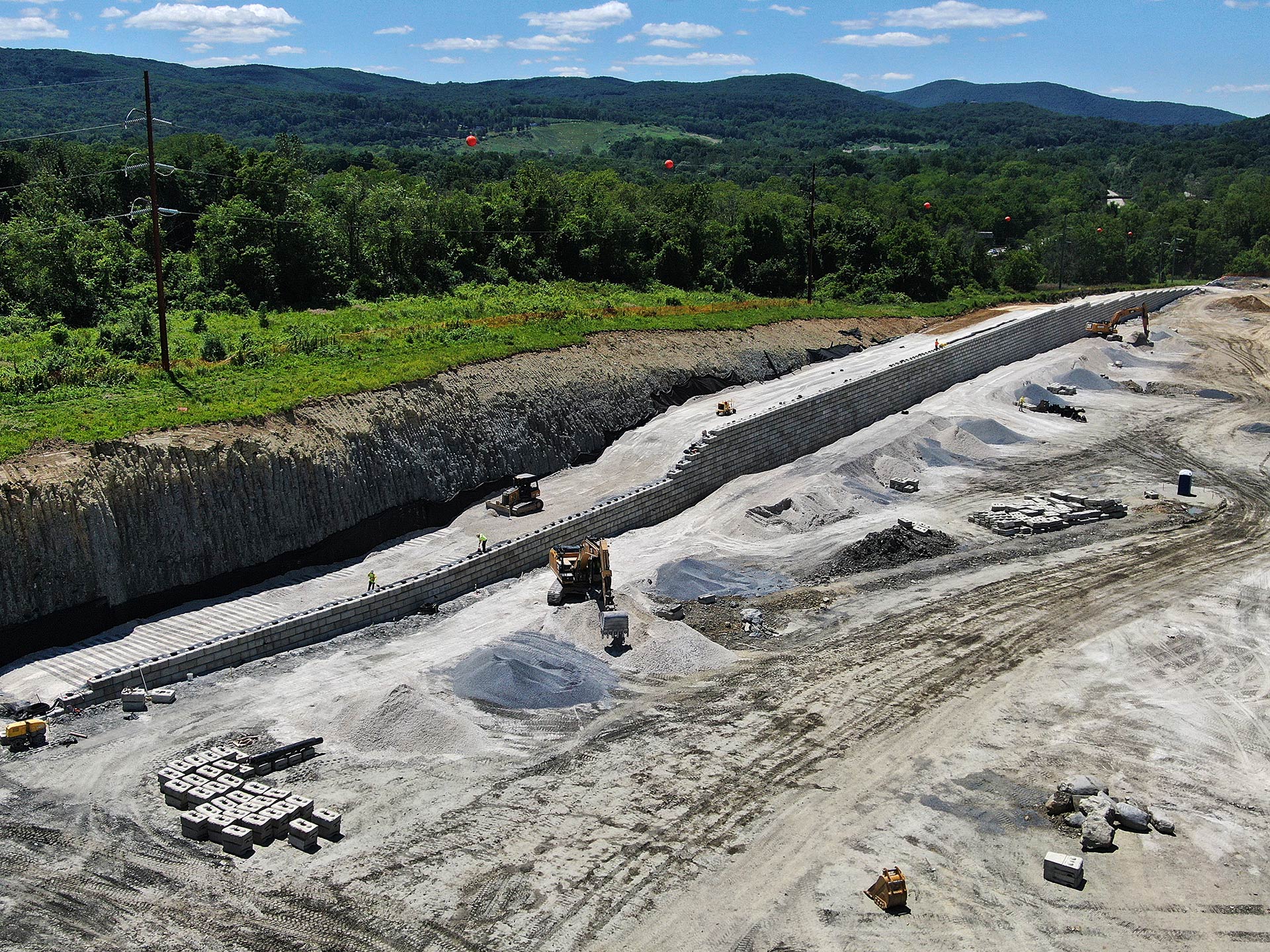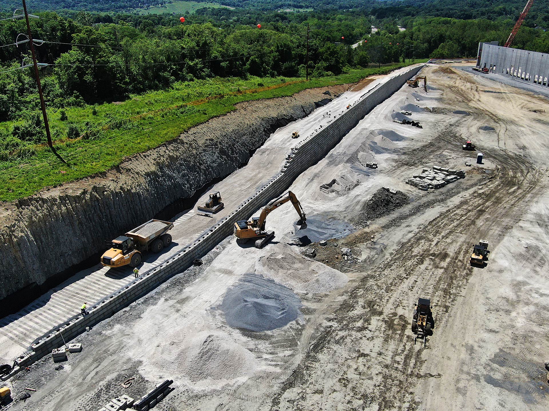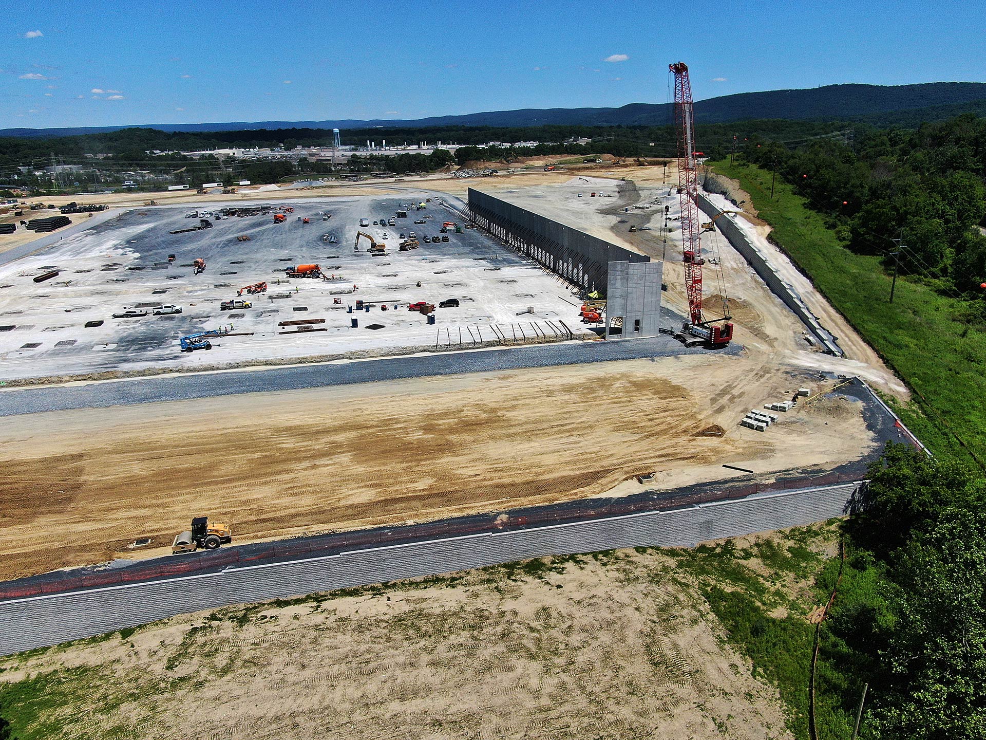 The next stage of Project Redtail in East Fishkill, New York, is in high gear. Site excavation continues while retaining walls are being erected around the perimeter of the construction site. The foundation for the warehouse has been levelled and prepared for construction. The preliminary warehouse wall is being set into place. Aggregate has been spread and packed in preparation for paving of driveways and parking lots around the new 629,186 square feet logistics facility.